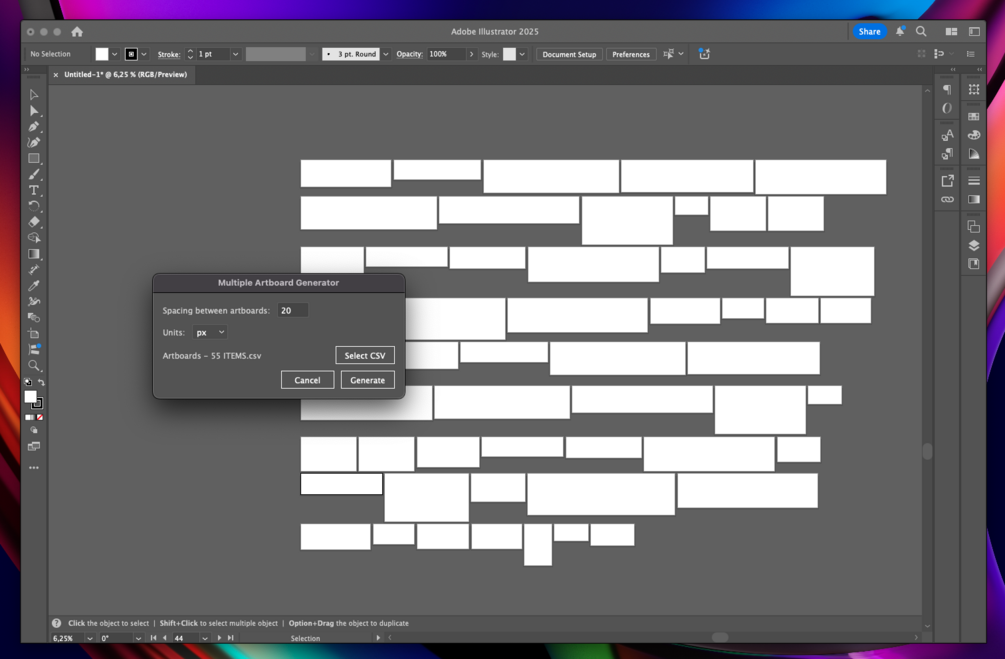 Tired of manually creating and sizing artboards in Illustrator? Setting them up one by one from a list can be slow and prone to errors, especially when working with large batches of designs. The Multiple Artboard Generator script does the heavy lifting for you, automatically creating a grid of artboards based on the names and dimensions listed in a spreadsheet - all in seconds!